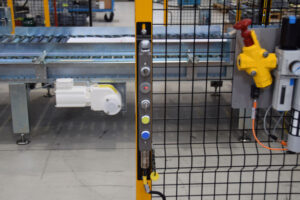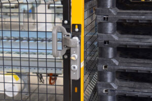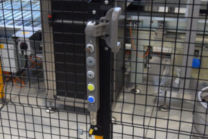 O sistema permite o acesso ao perímetro interno da máquina em questão somente após uma solicitação do operador, por meio de um botão dedicado. Após a solicitação, o sistema permite que a máquina se coloque em posição de segurança e, somente nesse momento, as portas são destravadas.